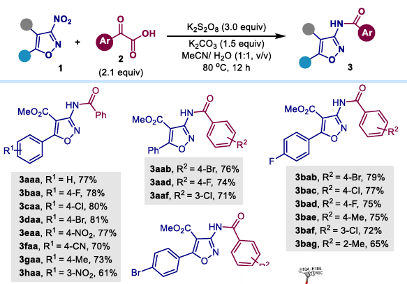 (1) 3-Nitroisoxazole substrates: Regardless of whether the aromatic ring has an electron-donating group (such as methyl) or an electron-withdrawing group (such as cyano), the reaction proceeds smoothly and yields the corresponding amide product in excellent yield. Various substituted aryl α- ketocarboxylic acids can also participate in the reaction well.