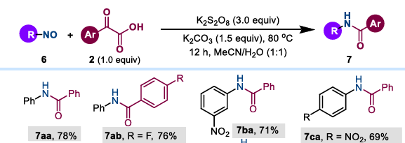 (3) Nitrosyl substrates: Based on a deep understanding of the mechanism, researchers have successfully extended this strategy to nitrosyl compounds. Under the same conditions, nitrosyl compounds and aryl α- ketocarboxylic acids directly yield a series of structurally diverse amides in moderate to high yields. This transformation is applicable to a variety of substituted nitrosyl aromatics, heterocyclic nitrosyl compounds, and aliphatic nitrosyl compounds.