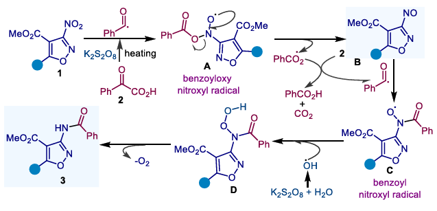 The team proposed the following reaction mechanism: Taking 3-nitroisoxazole substrates as an example, firstly, under a high-temperature alkaline environment, potassium persulfate decomposes to generate sulfate radicals, which then abstract hydrogen atoms from aryl α-ketocarboxylic acids and undergo decarboxylation to generate benzoyl radicals. Subsequently, this radical attacks the nitro group in the nitroaromatic hydrocarbon, abstracting an oxygen atom to generate benzoyloxy radicals and nitrosoaromatic hydrocarbon intermediates. The benzoyloxy radical reacts with another molecule of aryl α-ketocarboxylic acid to regenerate benzoyl radicals. Next, a second benzoyl radical combines with a nitrosoaromatic hydrocarbon to form a benzoylnitroso radical intermediate. Finally, this radical combines with hydroxyl radicals generated within the system, undergoing a deoxygenation process to ultimately generate the target amide product.