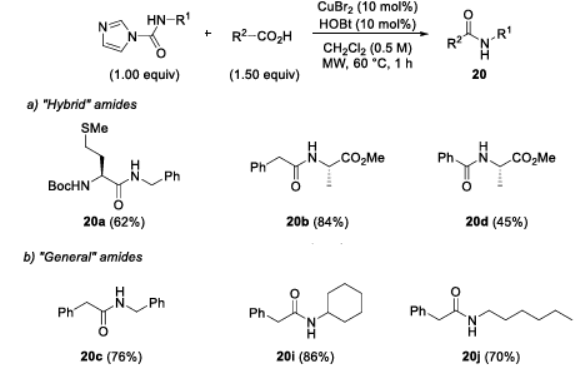 Based on the two-step synthesis, microwave irradiation was used to promote the bonding reaction of amides (Figure 4). The results showed that microwaves could significantly accelerate the reaction rate, shortening the reaction time from 20 h in the conventional method to 1 h, while maintaining a good yield and without the observation of racemization. Furthermore, the application of this method was broadened to the synthesis of conventional amides, and the yield met expectations.